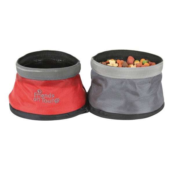 Der praktische Reise-Doppelnapf für unterwegs besteht aus hochwertigem und strapazierfähigem Polyester/Nylon und lässt sich bei Nichtgebrauch einfach und platzsparend zusammenklappen und per Reißverschluss verschließen.