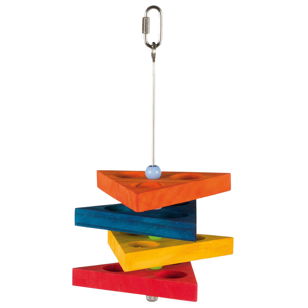 Die Snack Triangel ist ein tolles artgerechtes Vogelspielzeug zur Beschäftigung und geistigen Herausforderung. Die Mulden der einzelnen Holzebenen können mit Obststücken und anderen Leckereien befüllt werden. Durch Schieben der Holzebenen an der Edelstahlstange gelangt das Tier an die Snacks in den einzelnen Mulden. Spielend wird so die Geschicklichkeit Ihres Vogels geschult.
