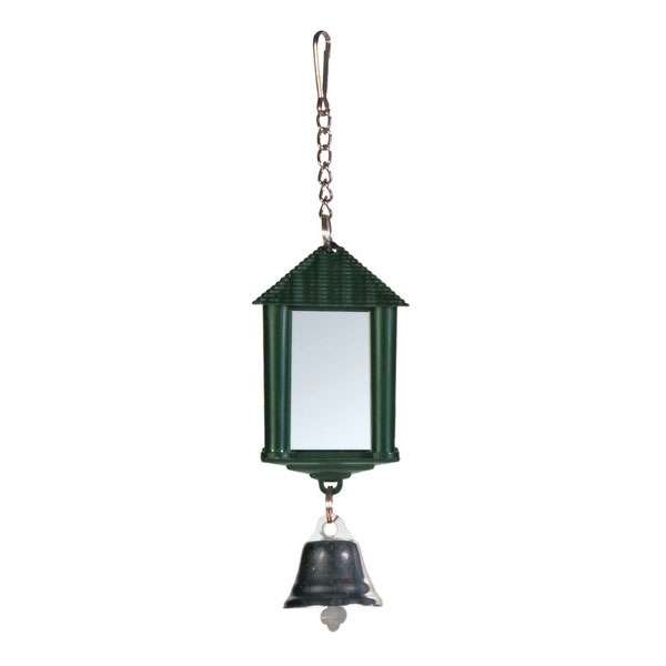 Die Spiegelampel für kleine Vögel ist mit Spiegeln und einer Glocke ausgestattet. Zur einfachen Befestigung im Käfiggitter ist oben eine Kette mit Haken vormontiert. Der Rahmen besteht aus Kunststoff.