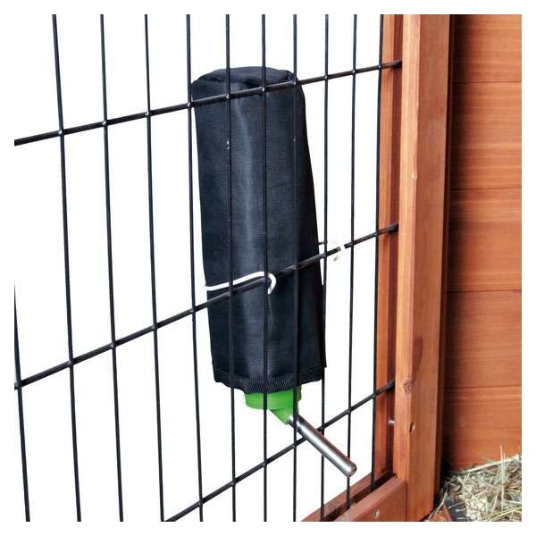 Diese isolierende Schutzhülle besteht aus robustem Nylon als Außenmaterial. Die Aluminiumfolie im Inneren vermindert das Risiko, dass das Trinkwasser einfriert. Ideal für die Nutzung am Außengehege. Die Isolierung wird einfach über die Trinkflasche gezogen.