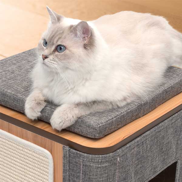Der Cubo wird in einer qualitativ hochwertigen Fabrik für Möbel hergestellt. Das 35 mm starke Memory-Schaumstoff-Kissen wird per Klettverschluss befestigt, damit ein sicherer Halt gewährleistet ist, und auch die Seitenabdeckung kann dank der Befestigung per Klettverschluss zur Reinigung einfach abgenommen werden. Die widerstandsfähige Kratzfläche eignet sich toll zum Krallenschärfen, während es sich im gemütlichen Lounge-Versteck mit 20 x 20 cm großer Öffnung toll schlummern lässt. Das Design mit grau-meliertem Polster und Walnussdekor-Laminat-Kanten passt sich perfekt in jede moderne Wohnlandschaft ein.